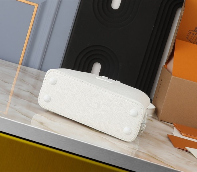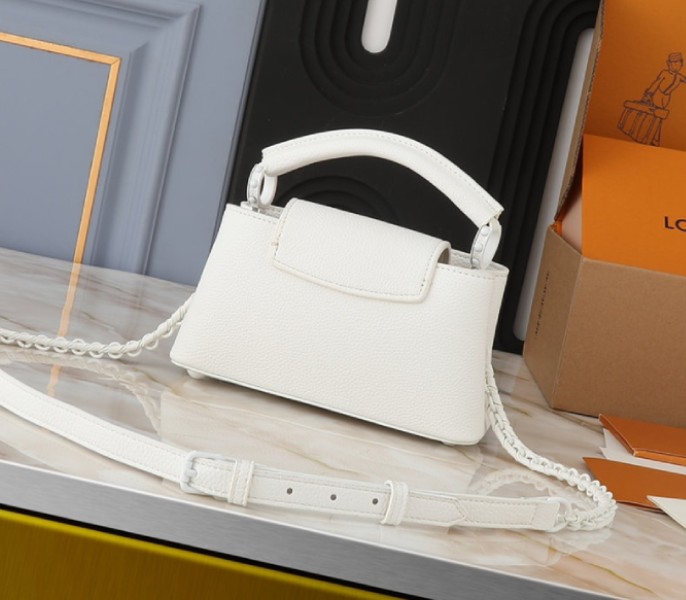 If there is one bag that defines “quiet luxury” with a modern architectural twist, it’s the Louis Vuitton Capucines East-West Mini in Optic White. This isn’t just a handbag; it’s a mood. The elongated “East-West” silhouette takes the classic Capucines DNA and stretches it into a sleeker, more contemporary form that feels fresh and incredibly high-fashion.