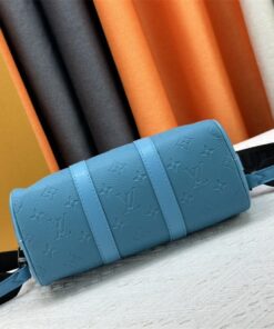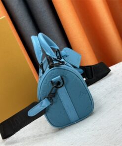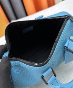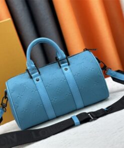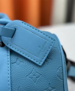 Elevate your accessory game with this striking Louis Vuitton Keepall Bandoulière 25. Dressed in vibrant turquoise Taurillon leather and embossed with the iconic Monogram pattern, this bag isn’t just a carrier—it’s a conversation starter. The matte black-toned hardware adds a modern, edgy contrast that keeps the look grounded and sophisticated.