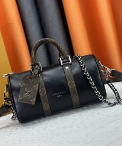 The silver-toned hardware adds a cool, contemporary touch that pops beautifully against the black leather. Inside, the textile lining is durable and soft, and the flat pocket is a lifesaver for keeping your ID or credit cards from getting lost at the bottom of the main compartment. It’s small, yes, but it’s mighty—it holds far more than your average “mini” bag thanks to that classic Keepall width.