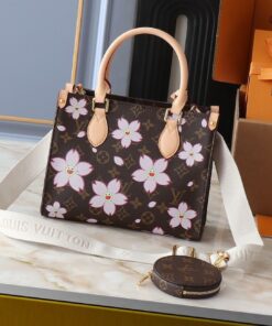Step into spring regardless of the season with this breathtaking Louis Vuitton Monogram Canvas Onthego PM. Dressed in the limited-edition “Sakura Brown,” this piece is a poetic reimagining of the classic monogram, delicately accented with cherry blossom motifs that add a whimsical, feminine touch to a structured silhouette.