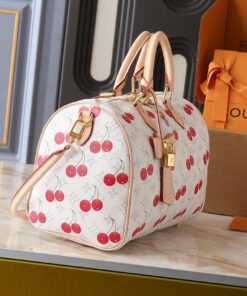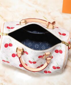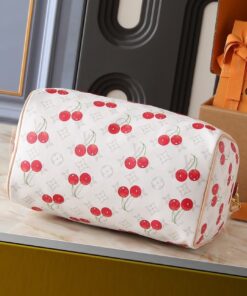 Elevate your daily rotation with a playful twist on a timeless icon. This collaboration breathes fresh life into the classic Speedy silhouette, blending the heritage Monogram with a vibrant cherry motif that pops against the crisp white canvas. It’s the ultimate “it-bag” for those who love a mix of high-fashion luxury and whimsical street style.